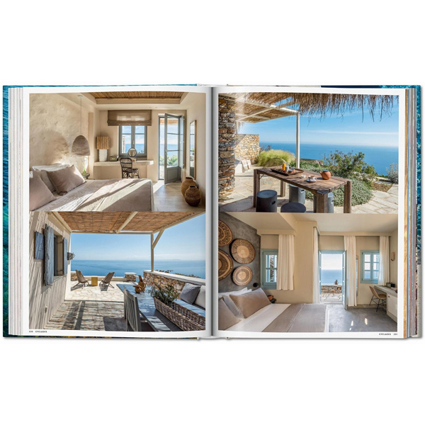 کتاب شما را به هتلهایی در جزایر معروف مثل Santorini و Mykonos میبرد و همچنین اقامتگاههای دورافتادهتر مثل Mediterraneo در Kastelorizo را نشان میدهد.